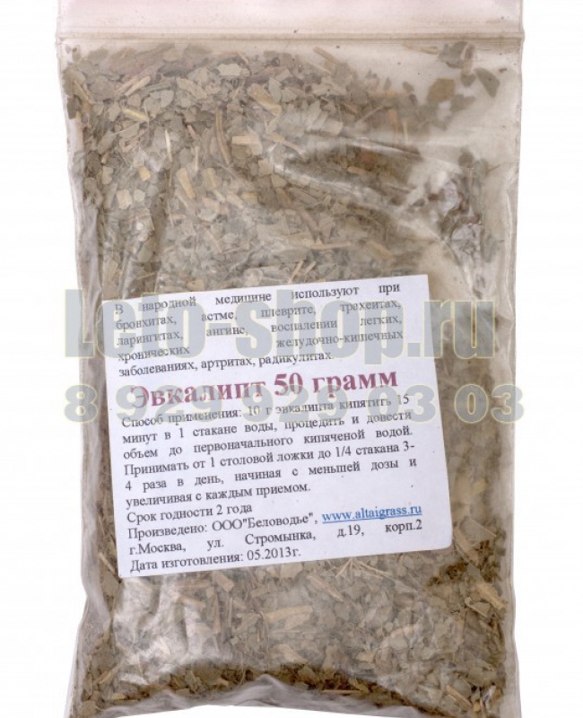 Противопоказания:индивидуальная непереносимость компонентов. Не является лекарственным средством.Эвкалипт рецептыРецепт отвара. Для приема внутрь и полосканий 10 г листьев эвкалипта заливают 1 стаканом горячей воды, кипятят 5—10 мин на водяной бане, фильтруют через два-три слоя марли и охлаждают до комнатной температуры. Принимают по 1 /4 стакана 3—4 раза в день. Для ингаляций и полосканий требуется 1—2 столовые ложки сырья на 1 стакан воды.Для приготовления наружного отвара листьев 30 г сырья заливают 1 стаканом горячей воды, кипятят на водяной бане 30 мин, остужают, процеживают через два-три слоя марли и доводят объем до исходного. При наружном использовании отвар разводят кипяченой водой в соотношении 1:4. Настойку эвкалипта готовят из измельченных листьев. Для этого 20 г сырья помещают в стеклянную тару с плотно закрывающейся пробкой, заливают 100 мл 20 %-ного спирта и настаивают 10—15 дней в теплом месте. Принимают по 15—30 капель 3 раза в день с 1 /4 стакана воды. Наружно ее используют для купирования болей. Для этого в больное место втирают не менее 1 столовой ложки настойки и укрывают шерстяной тканью. Процедуру повторяют 2 раза в день. Курс лечения —1— 2 недели. |