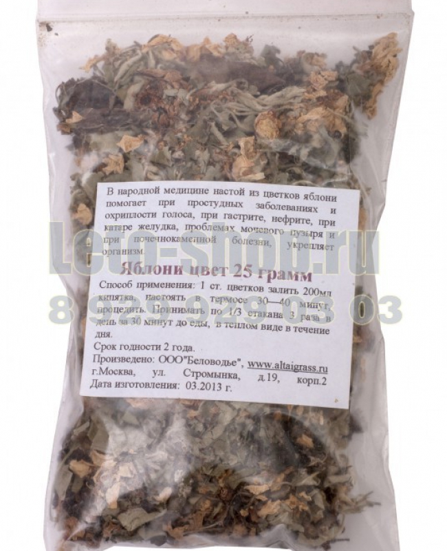 Противопоказания:индивидуальная непереносимость компонентов, беременность, кормление грудью. Не является лекарственным средством.ОписаниеЯблоня лесная. Дерево семейства розоцветных высотой до 10 м. Корень отвесный, глубоко внедряющийся в землю. Кора серая, более молодые ветви бурые. Листья простые, очередные, яйцевидные. Цветет в мае. Цветки крупные, правильной формы, собраны в мелкие щитки на длинных цветоножках. Плод желто-зеленый или краснеющий с одного бока, диаметром до 5 см. Созревает в августе — сентябре.Яблоня лесная распространена в европейской части России, в основном в Нечерноземной зоне, на Кавказе, в Крыму и Средней Азии. Растет одиночно в лесах разного состава, но преимущественно в лиственных. Цветет и плодоносит на открытых местах — опушках и полянах. В лесостепных зонах образует небольшие массивы. В горах растет на высоте до 1000 м над уровнем моря. Используют плоды и древесину и цветы яблони. Из плодов готовят квас, компот, яблочный уксус, желе, пастилу и мармелад, розоватокоричневая древесина идет на изготовление сувениров и поделок. Плоды служат хорошим кормом для диких животных. Растение является хорошим медоносом. Купить цветы яблони по цене 95 рублей. Скидки при покупке курса цветков яблони.